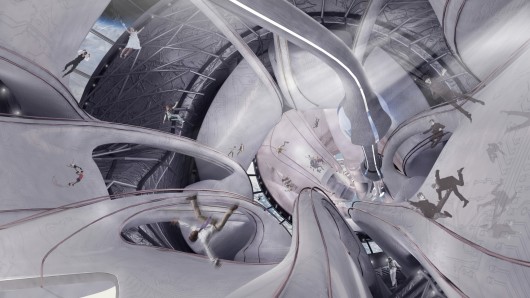 Named after the Greek word Peripeteia, Pozo’s project represents a turning point in human habitation brought about by space exploration. Studying under his project tutor, Hani Rashid, Pozo looked to numerous early concepts including Georgy Krutikov with Flying City, Paolo Soleri with Asteromo and Greg Lyhn with New City. These works formed a theoretical foundation upon which Pozo could refer to the scientific concepts of Gerad O’Neil to organize a system in which life is made possible in space through “Artificial Gravity.”