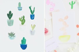 You can also paint images of cacti and succulents and tack the paintings to the wall for a unique twist. For inspiration, in the next image we see Green Cacti Wall Art from The Land of Nod (left), as well as watercolor images painted by Lexy Ward of Proper (right), created as favors for a Mother’s Day workshop she hosted at Anthropologie:
