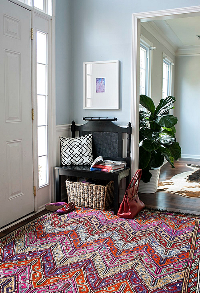 Are you afraid that adding an entryway space will make your living room seem smaller? Adding a mirror will dissolve that fear. Not only will it reflect light into the room, it will make the space look bigger. Plus you’ll be glad you have it when you need those last minute hair checks before walking out the door. (via Amber Interiors)