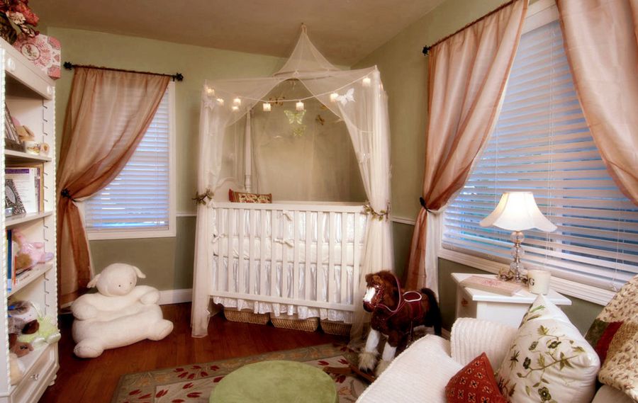 Sometimes the crib canopy is merely an accent feature and is not meant to have any functional use. It’s the case with the ones in the corner. This design suits traditional nurseries and goes well with ornate cribs and furniture in general.{found on creativewallcoverings}.