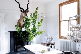 How do you make a clawfoot tub really stand out? You paint the outside a dark color in a way that matches the gorgeous nearby fireplace. First up is an eclectic bathroom from My Domaine, with a deer head and a crazy chandelier hanging from a coat stand. The next one features a white bathroom with black to highlight the two most important parts of the room from Daily Dream Decor, and a third shows smokey dark walls beside a painted tub from Desire to Inspire.