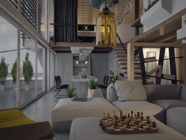The first penthouse in this post is from the Ukraine. The modern two story space is steeped in cozy decadence. Overstuffed chairs and ottomans demand relaxation of the body while simple, clean design calms the mind as well. The lofted bedroom area is particularly comfortable, using its comparatively minimal area to create a nest that’s ideal for sleeping or intimate conversation.