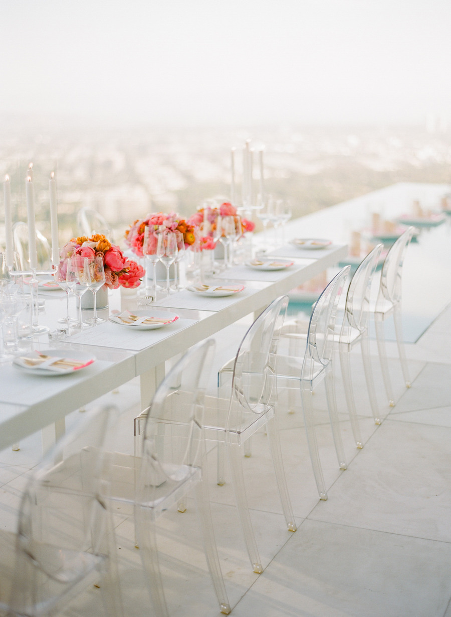 If you want the focus to be on the table décor, make a big centerpiece using similar but slightly different colors and shades and place it at the center. Everything else should be as simple as possible. It’s why the acrylic chairs are an excellent choice in this case.{found on charlastorey}.