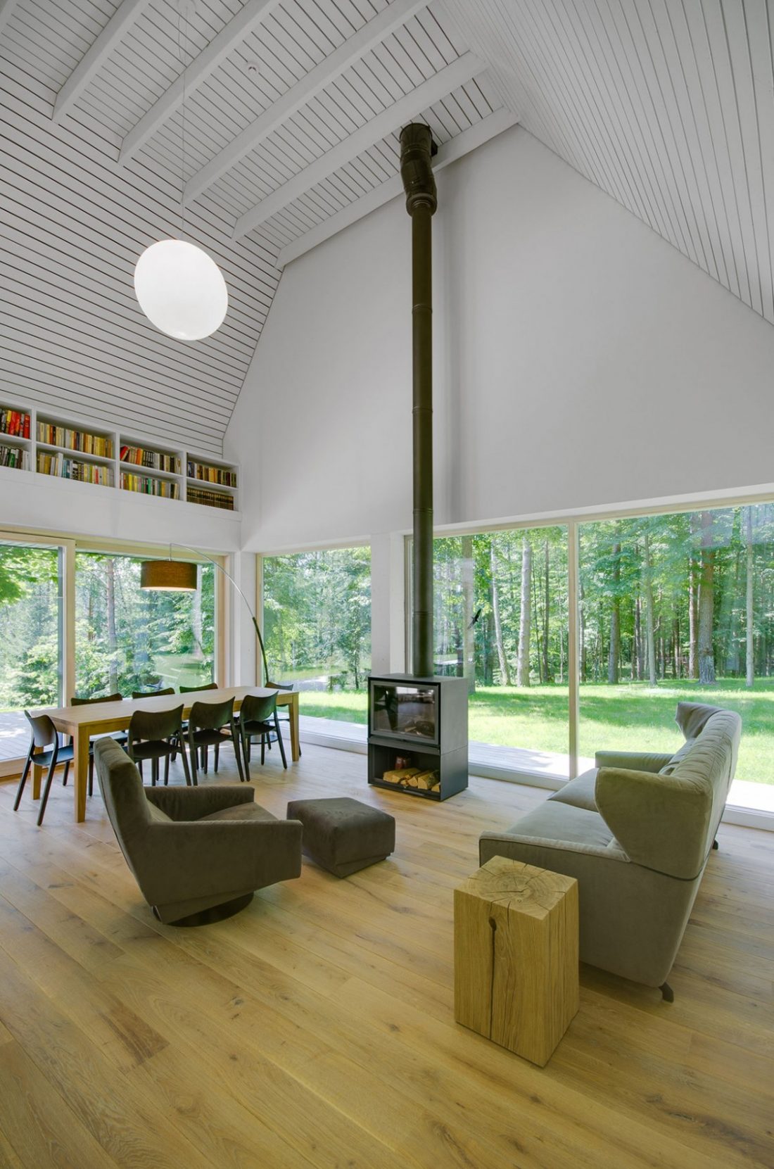 This house is Trakai designed by Aketuri Architektai has a really lovely living room decor, with large windows, comfortable seating and bookshelves placed high above the windows where they take up zero floor space.