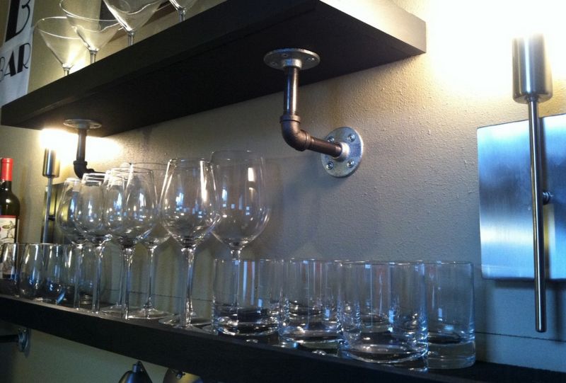In order to add an industrial look to a shelf, metal pipes can be used as brackets. They can suit and complement shelves used in contemporary or rustic environments, in areas such as the laundry room or the kitchen.