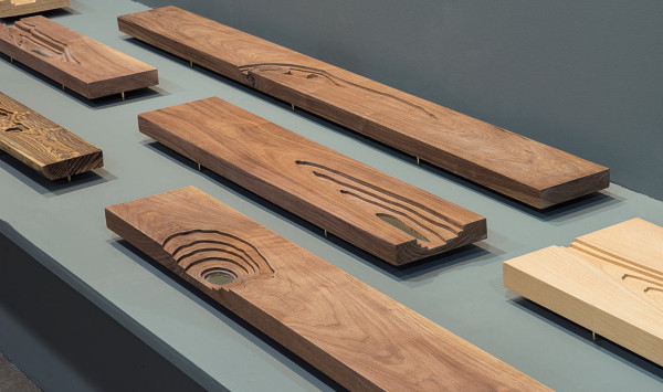 Héctor Esrawe worked with Emilio Chapela on the Estratos trays. Made of solid wood and brass, each tray was made after the natural designs of the wood were photographed, digitalized, and then traced onto the surface of the wood with a robot. That process was repeated until a pattern was slowly engraved into the wood.