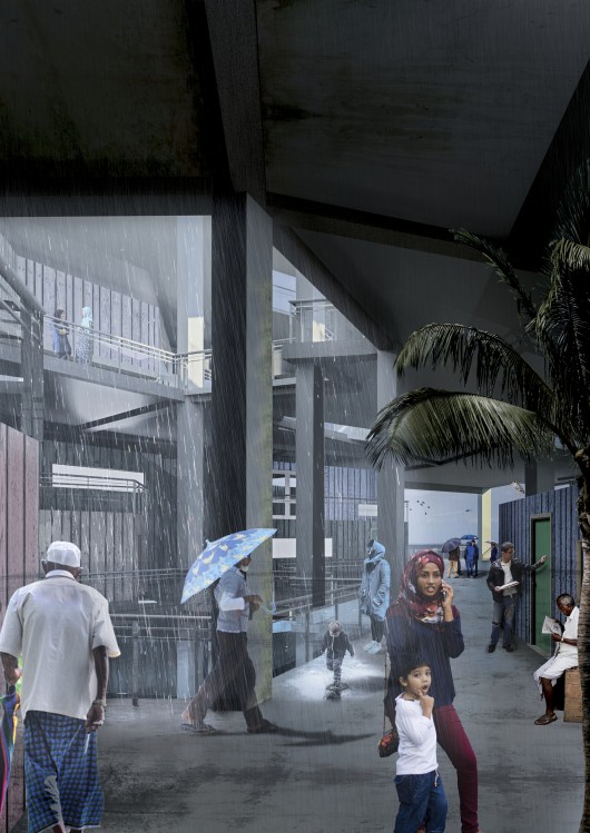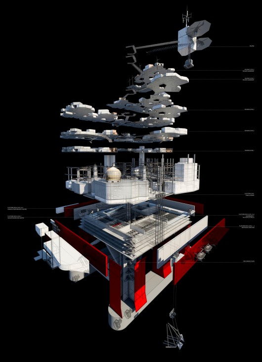 Thammalla’s proposal, entitled “Swim or Sink”, argues that not only could the entire population of the Maldives be realistically housed on a series or more or less generic oil rig templates, but that these rigs could also be adapted to support the existing Maldivian culture. Starting with a rigorous assessment of both the socio-cultural structure of the Maldives and the semi-submersible oil rig template, Thammalla has attempted to reconcile the two concepts into a unifying plan that recreates the qualities of the current capital of Malé, using similar enclosure-to-open-space ratios to provide familiar feeling spaces for the inhabitants. The plan goes even further to integrate Maldivian history, proposing the use of once-common traditional materials of coconut timber for the housing units in order to try and provide a link with the past that even modern Malé fails to do.