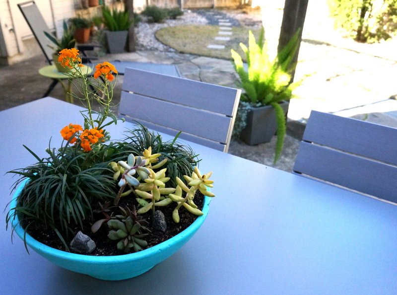 Above we see signs of spring on my patio. The grass is still dead, but now that I can see the colorful planter below from my living room, things don’t seem quite so bleak!