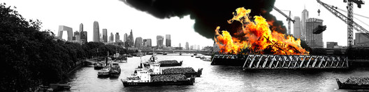 Built on an enormous monolithic steel jetty abrasively dividing the Thames, London’s eternal flame burns green. Green, that is, from the city’s many public parks razed to sustain the demanding fire. Fortunately for developers, London’s eternal tree-fuelled flame frees up crucial wasted green space for the creation of more “narcissistic phallic towers, helping to crowd the skyline and ruin vistas across the city.” This winning idea produces a constant stream of billowing smoke to obscure London’s crane-filled skyline — a visual byproduct of overdevelopment. Adjacent to the flame, London’s south bank will become a storage facility for cranes: an essential component in a development-driven economy.