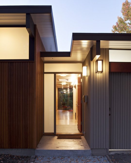 How do you expand an L shaped Eichler with the challenge of extending a long dark entry? Klopf Architecture’s solution, to design a light filled atrium in the hallway to open up the bedroom expansion with green plants, sky lights and a glass wall. Not to mention the thoughtfulness of a blind door with wood siding similar to the rest of the home.