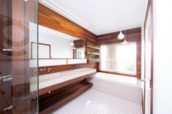“Chris and I wanted to create a space that felt local to San Francisco and the bay area so we sought after local materials, and more importantly local craftsman, us of course,” Fidel explained. They researched materials and chose pickled redwood for the north wall, shower, medicine cabinet and planters and then concrete for the sink and other small details. The tile is also local—from Heath Ceramics.
