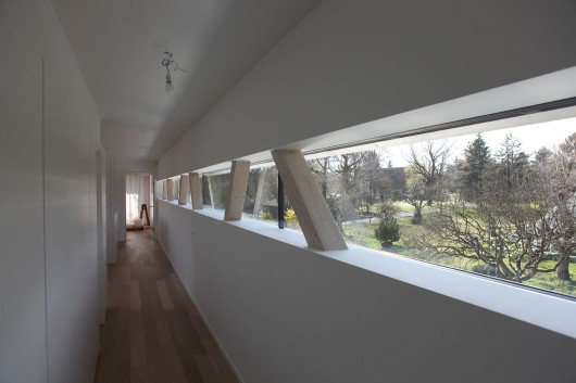 The building is comprised of ground floor masonry volumes on which is placed a wooden structure made of two large truss- es spanning the entire length.The insulated triangulated framework freely runs on the inside of the windows and provides a deep sill.