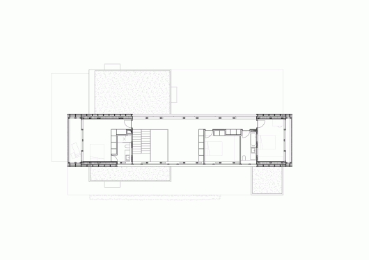The solution proposes two volumes on the ground floor, respectively a garage to the north and the living area to the south, connected above by a volume containing the bedrooms. In addition to the terrace to the south, the area resulting from the bridging of these two volumes offers a generous covered entry suitable for various activities.The house is accessed by a slightly elevated drive way that follows the western prop- erty line, bypassing the terrace and entering the house from the rear covered area.