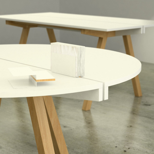 Minima Design Studio designed the ASSI Tables with a split down the center that visually breaks up the typically plain surface. The channel holds specially designed accessories that can store things in place while you’re enjoying a meal, preventing them from falling off the table.