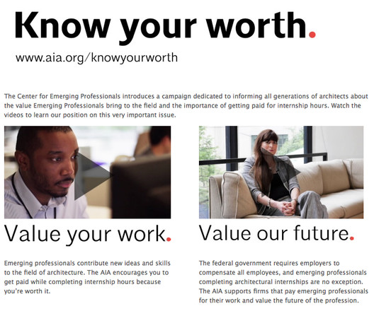 The American Institute of Architects’ Center for Emerging Professionals has announced its newest campaign, called Know Your Worth, which seeks to inform “all generations of architects about the value Emerging Professionals bring to the field, and the importance of getting paid for internship hours.”