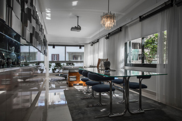 Once you enter the apartment, you immediately leave the outdoors behind and lose your bearings – that’s intentional. The hallway acts as a “backstage” area for the lounge, kitchen, and private spaces, and it’s dark grey walls and seamless floor do just that. On one side of the hallway, there’s a glass box that lets visitors peep into the lounge area on the other side.