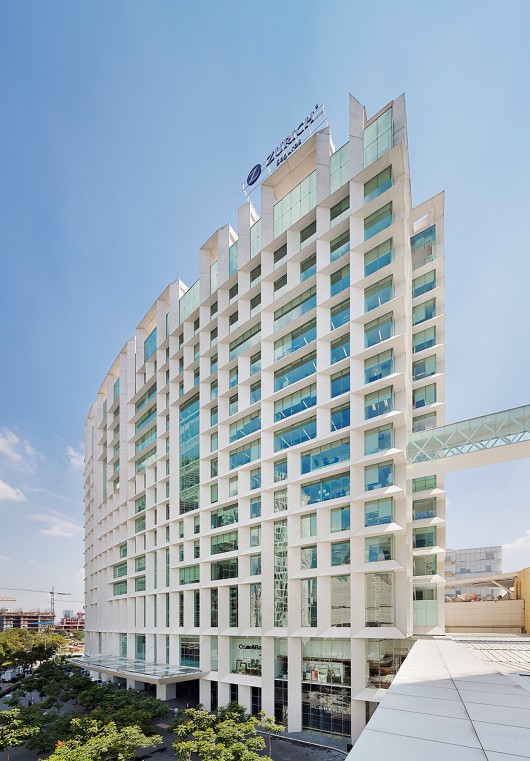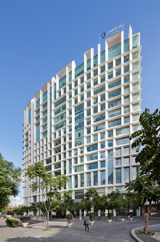 The design of the facade corresponds to and accentuates the interior function of the building. It is an interesting form of rectangular modules of different sizes, all oriented towards the same vanishing point and made with a design based on prefabricated elements. The vertical elements extend after the last level and wrap the empty space on the top floor extolling the verticality of the building. The different rhythms of these modules create a play of light and shadow that causes a feeling of greater depth and yield different effects depending on the time of day.
