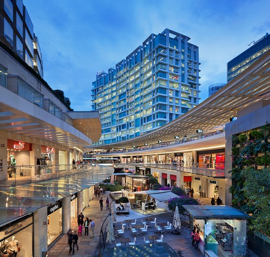 A large square in front of the second phase was designed on Av. Miguel Cervantes Saavedra with fountains and gardens as main vehicle and pedestrian accesses. At this level there is a lobby with valet parking. The ground floor and basements are independent, irregularly shaped and are internally connected by a helical ramps for better performance.