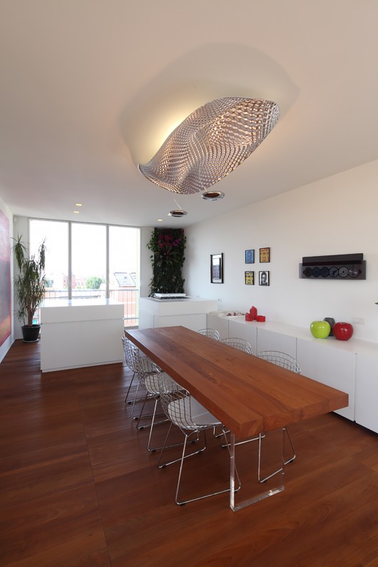 From the architect. The space of an attic has been reinvented with great skill and sensitivity to the intrinsically architectural aspects. The vertical walls have been turned into light-permeable surfaces, leading onto the exterior areas, where the large terrace can be used as an extension to the living quarters.