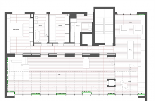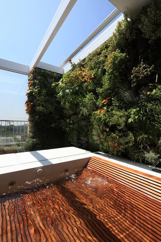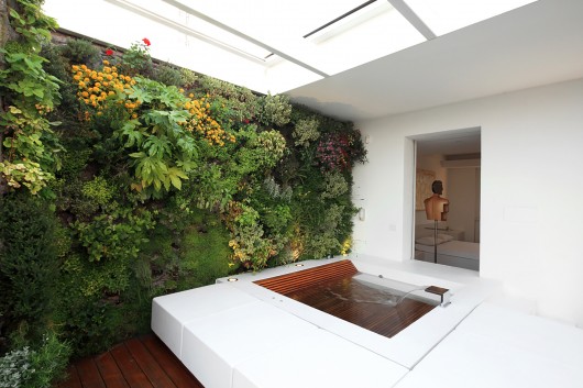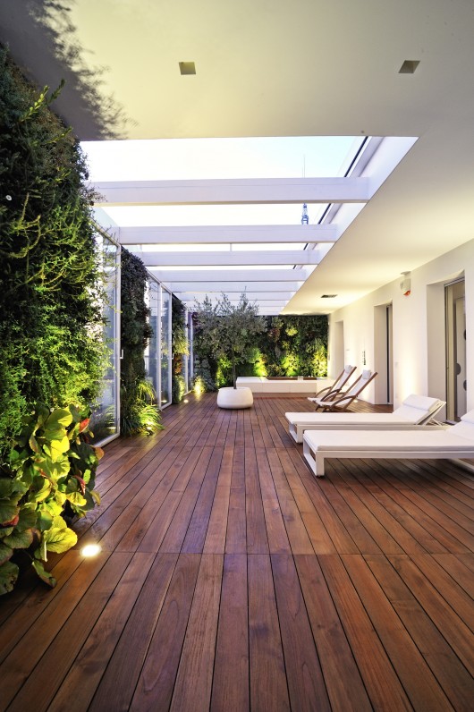Looking onto the terrace from all the rooms, the view is always focused on one of the vertical garden modules, arranged in a strict geometric pattern based on the 1 +1 +2 form, perfectly mirroring the apertures in the large brick wall.