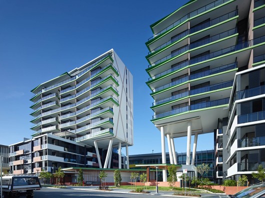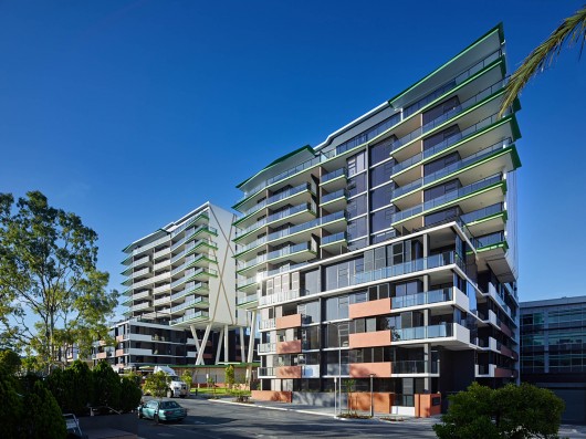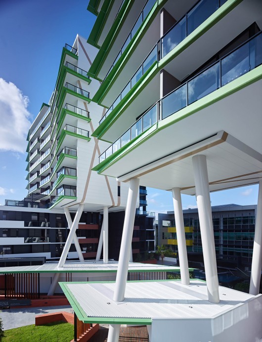 From the architect. The Arena Apartments development in South Brisbane is unlike anything else in Brisbane. Designed for Sydney based developer, Galileo Group, the favourable site offered an elevated North East orientation with expansive views towards the city. Its distinctive form has been generated as a direct response of overlaying the functional requirements of the brief with the specific site constraints, including a new cross block link connection through to West End, and the requirement to maintain views through the site for the office building behind.