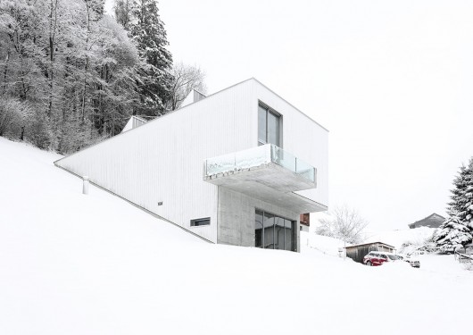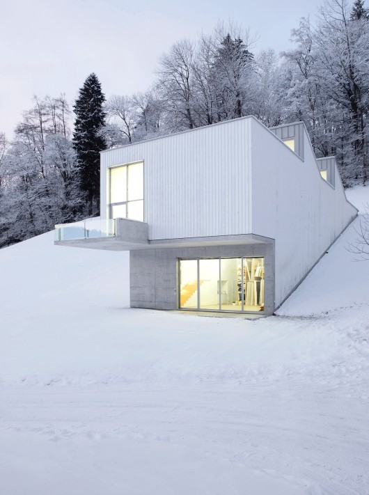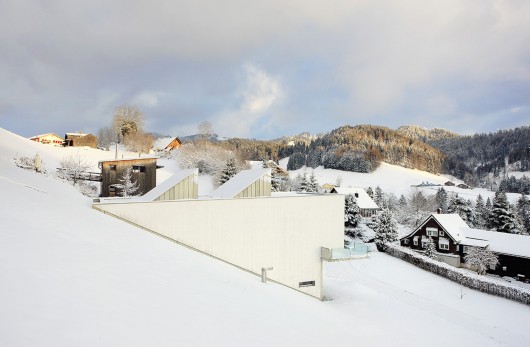The principal volume and the skylights are triangles that stand out on the mountainside, giving the building its characteristic outline. With its industrial finishes, volumes and white colouring, the project seeks reasonable mimesis with the residential constructions around it and the snowy landscape of the Saint Gallen region.