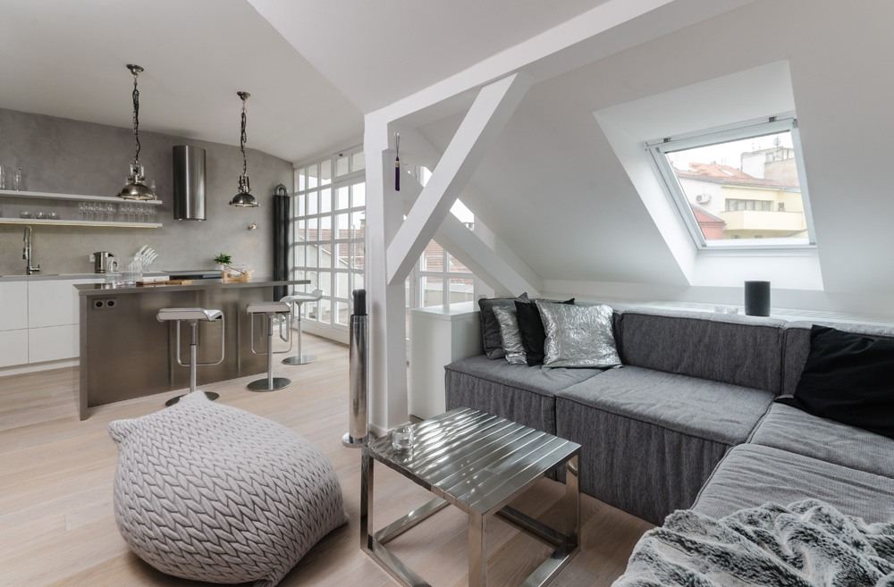 The apartment also has another space which could serve as a guest room or home office. In here, the team designed a custom desk and placed a small, casual sofa under one of the slanted windows. They added two compact coffee tables and another cozy Slumber pouf but this time in black.