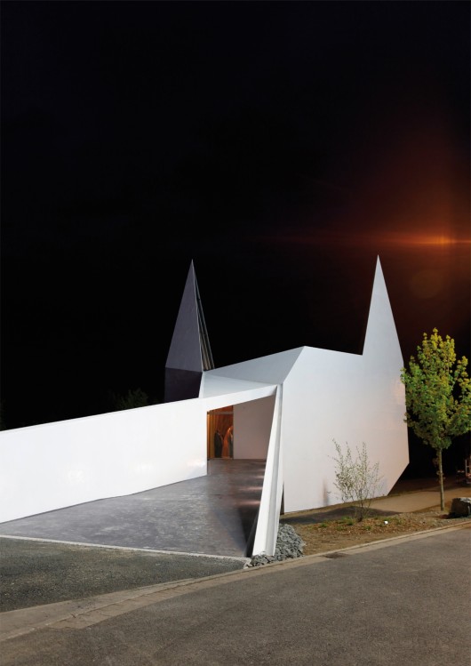 The three-dimensional translation of the church pictogram – a stylised white silhouette of a traditional village church – can be seen from both the motorway and the service station. From close-up the church appears to grow out of the hillside and visitors enter it via a raised walkway leading to a covered entrance. Once inside, contrary to the expectations raised by the exterior of the building, the design of the interior comes as a surprise. The inner dome opens up to the naturally lit area around the altar, illuminated only from above through the two church spires. The filigree wooden vaulting also displays a finely worked cross-ribbed structure.