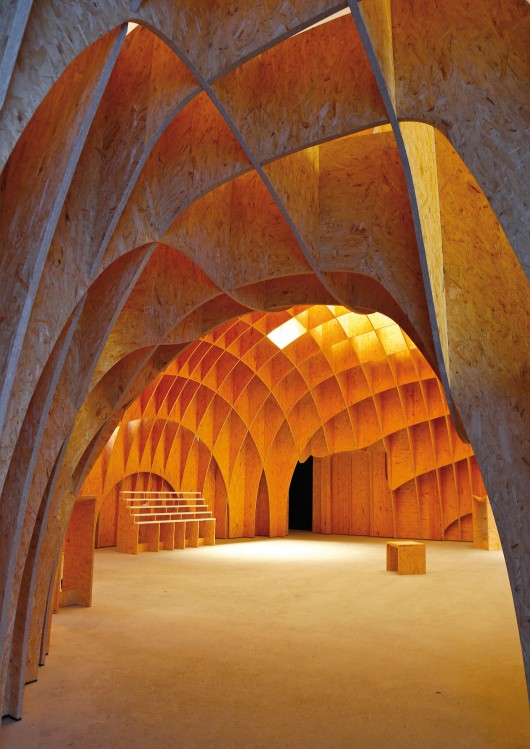 The inner dome consists of 66 vertical and horizontal semi-circular timber structural ribs,made up of 650 individual parts. The timber ribs are slotted into each other and secured in the slits cut into the panels, so the structure has not only rigidity but is also self-supporting.