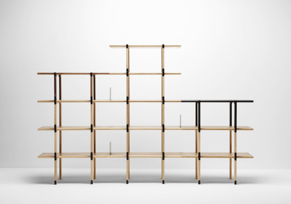 The fixtures between the shelves are a purposeful contrast against the wooden construction, and consist of only a few screws that run through the solid metal plates. In addition, integrated book dividers also serve as fixtures for the shelving units. Basic Shelving System is currently available in a number of solid wood finishes: Oak in natural or white oil, Ash, and European Walnut in natural oil.