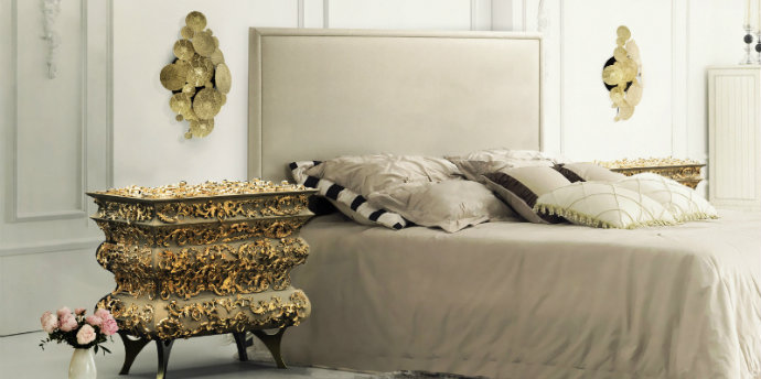 This luxurious bedroom proves that a neutral colour palette can still make for an exquisite space. The detailed gold bedside table (Crochet) is clearly the centrepiece of the room, complemented by the golden wall sconces (Newton) by Boca do Lobo.