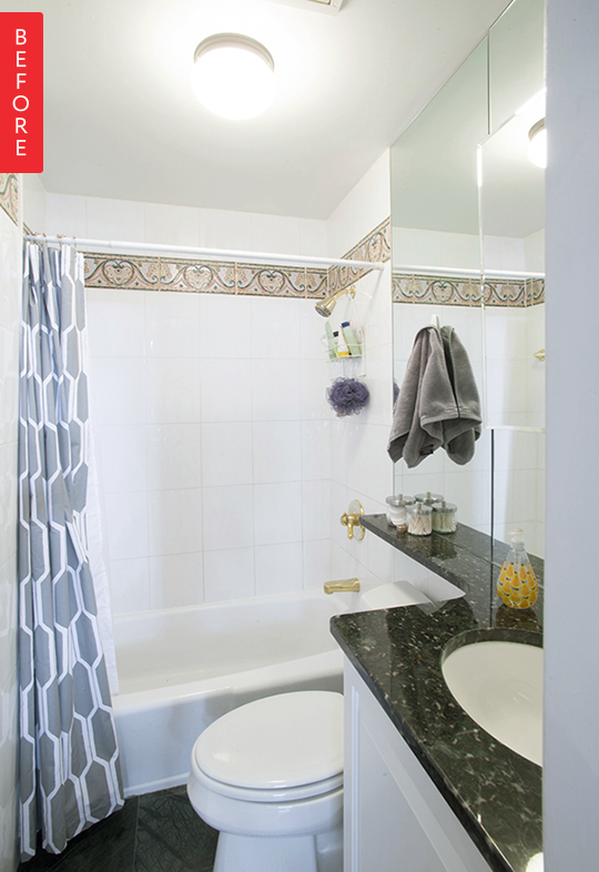 The bathroom in Amy’s Brooklyn Heights condo wasn’t terrible or falling apart. But after living there for a while, she started to notice how the finishes picked by the previous owner weren’t in line with the style of the rest of her home, and the vanity cabinet and countertop extension were making the narrow bathroom feel unnecessarily cramped. So she decided to swap out a few fixtures, and replace the tile, to make her bathroom feel bigger and give it a classic, timeless feel.