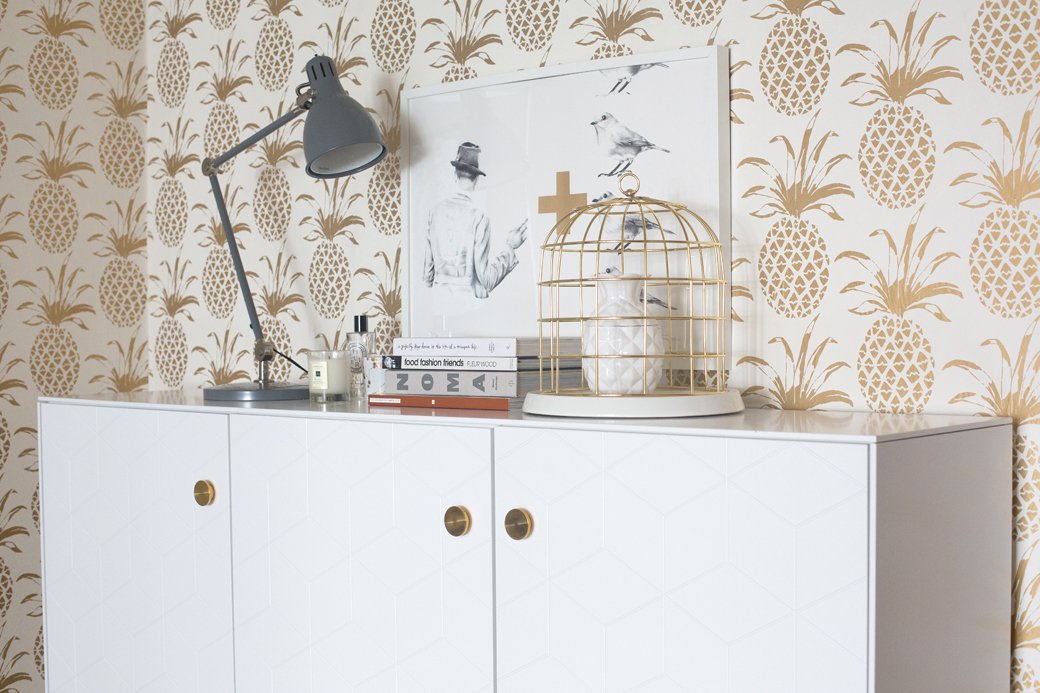 In fact, Superfront can be seen on the pages of magazines like Elle Decoration for this very reason – people are using their products to breath new, stylish life to IKEA cabinets. You can customize your entire kitchen, office, sideboard or entry cabinet for maximum impact. Superfront has many colors to choose from, lots of different legs and a lovely selection of hardware. You can see a little glimpse above of how I pimped my Besta, but would you like to see the big before and after reveal, where I turned a depressing corner with white wood chip wallpaper and a lonely gray cabinet into a statement making entry?