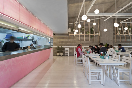 The hall is contained by a wall of concrete cylinders where a wood shipyard is inserted alluding to the workshop of a pier, existing vegetation between each wooden structure complements the composition of the wall, creating a focal point for the user.