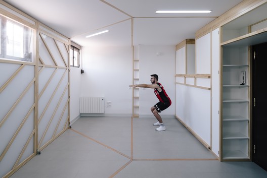 The project hinges around two complementary strategies. Firstly, an open space is configured, and the whole programme is grouped and arranged around an L-shaped band on two sides. This band includes the access to the household, the outer façade windows, a folding bed, the storage space, a complete kitchen, a fold-down auxiliary table, access to the bathroom and the washing machine. It optimises the spatial distribution and compacts all the functions so that everyday activities can benefit from as much space as possible, all the while adapting to the geometry of the apartment. Secondly, a fitted screen on one of the sides can be deployed from the wall to create different domestic arrangements, by closing the bedroom, the kitchen or dividing the house into two.