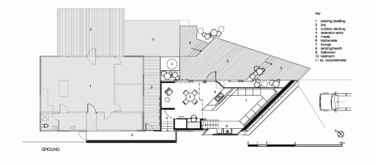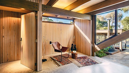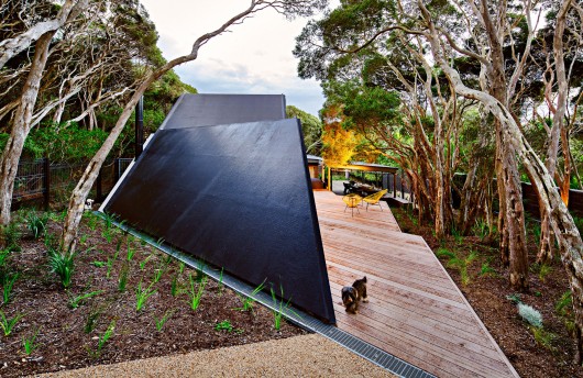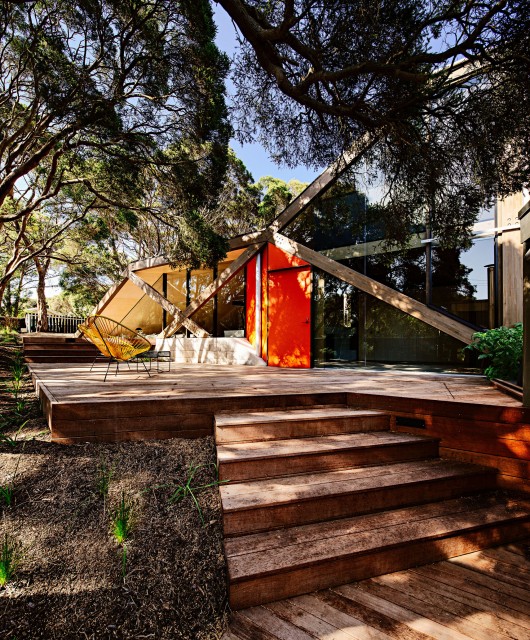 From the architect. Cabin 2 is an extension/addition to an existing 1960s log cabin located in bayside Blairgowrie. The surrounding coastal Moonah woodland forgivingly hides a suburban-like density of houses and network of winding roads free of formed kerb, gutters and footpaths. Many of the houses are holiday homes and there is an accompanying high level of development activity.