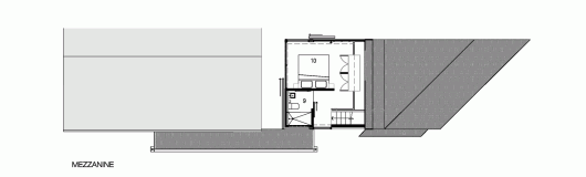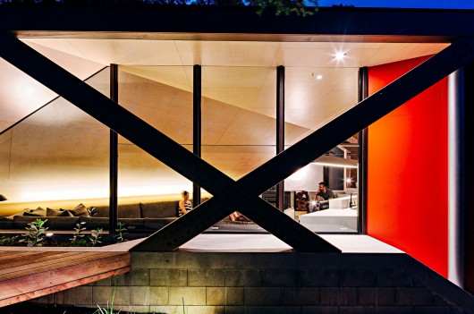 The roof directly reflects the internal volume and the program of functions underneath which lead upstairs to the elevated bedroom offering extensive alley views. The roof form is unified so that roof is ceiling and the structural timber frame is fully exposed both inside and out to convey both a structural and architectural honesty.
