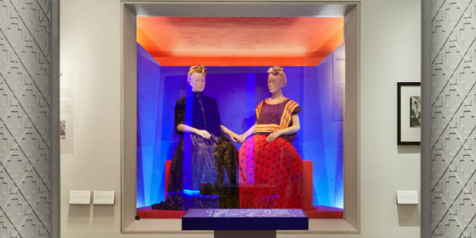 In order to create an atmosphere that would resemble Kahlo’s style, Gibson Thornley and Tom Scutt travelled all the way to Casa Azul, in Coyoacán, to study its details. Entering the exhibition, the visitor is welcomed by a tunnel with rectangular pillars covered in a 3D geometric print – a reference to the traditional dresses of Tehuana, worn frequently by Frida. The opening piece is inspired by The Two Fridas (1939), with two mannequins holding hands, one wearing a modern European dress and the other the traditional Mexican dress.