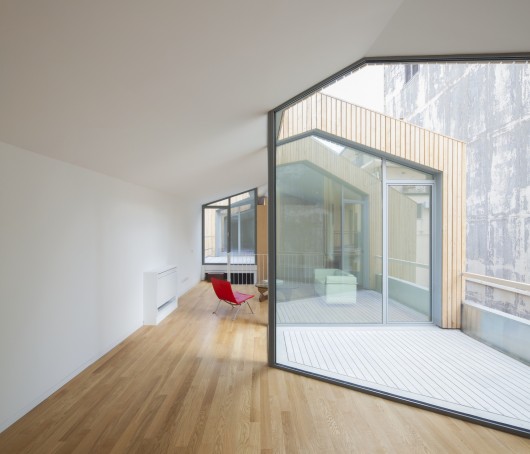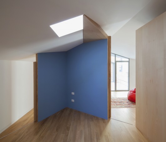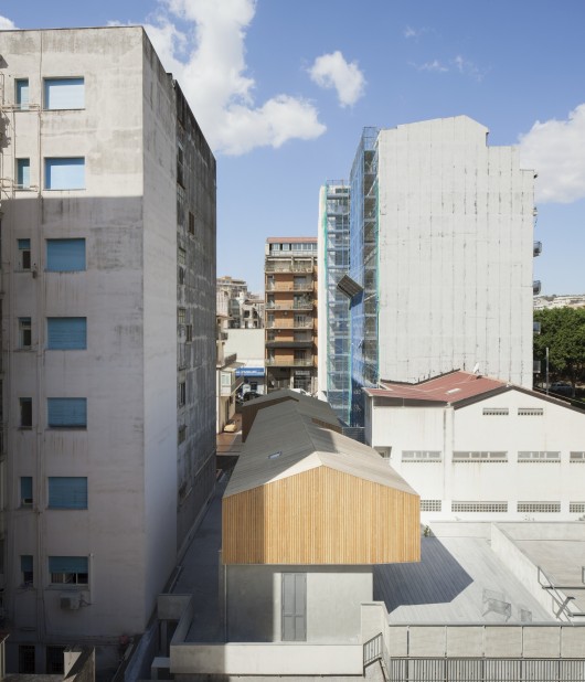 A prism wooden “hut ” is placed on the lava fragment of the house, rotated 6 degrees and cut on the volume below, carved by two terraces on the diagonal gashes: a gem set between the heroic rears of tall buildings.
