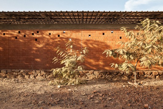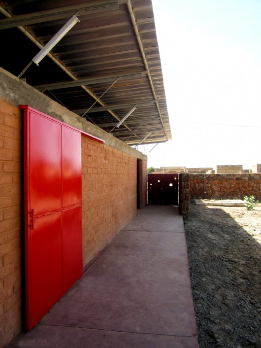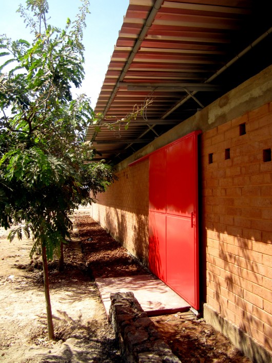 The enclosure of the lot was made with lateritic rock arranged as dry stone walls, which along with the earth brick facades and planted acacias allow warmth to that stretch of road as opposed to the cold and unfinished walls of cement mortar block prevailing in nearby buildings.