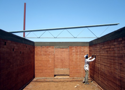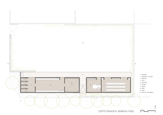 The program consists of two distinct activities, literacy of street children and sports school. The offset entrance allows to distribute substantially on either side of it the different programs; on the east side are the staff room and training room, and on the west side the changing rooms, showers and bathrooms. Latrines are placed at the western end of the lot to take advantage of natural ventilation of the prevailing winds from the east that will evacuate possible odors, minimally affecting the other rooms.