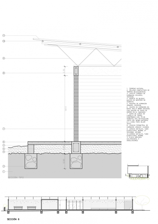 The building is topped with a fully exempt roof in order to avoid the most direct sunlight on the walls and to be able to quickly evacuate rainwater. A kind of parasol-umbrella metal structure and cladding with ribbed galvanized plates. Only the teachers’ lounge area has a roof made of reinforced concrete 12 cm thick slab. The rest is open at the top to the metal plate which facilitates natural lighting and ventilation.