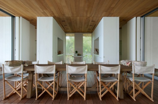 Inspired by the work of conceptual artist James Turrell, retractable glass walls on the East and West sides of the living area frame views of ocean, jungle and sky, while allowing for light and air to flow through the home to create optimal comfort. The central space of the house is essentially an open breezeway, allowing visual and pedestrian connectivity across the site. Within this pavilion space, there is the living and dining areas that open onto large verandahs well protected from the elements by the deep overhangs of the gabled roof. A kitchen and four bedrooms are simply arranged around the central space.