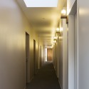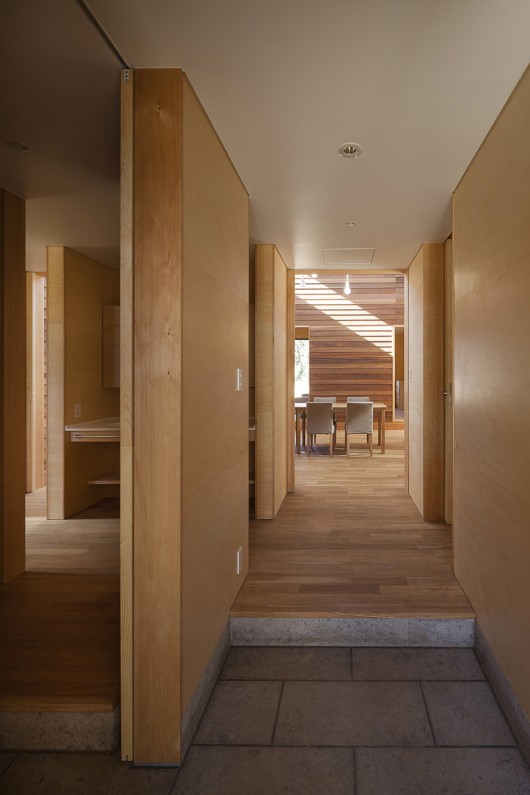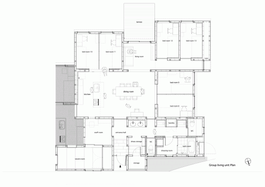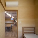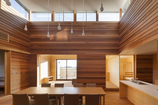 A group living unit is the house where 6 or 7 children live as a family. Two group living units are connected and composed of two families. We design the dining room with high side-light like outside space, and design the outdoors-like atmosphere by the wall made by clapboard of red cedar. The dining room are surround by children’s private rooms, and the children can watch each other easily. The warm light leaks out from the high sidelight, and makes the warm atmosphere for the children who come back to their houses in the night.