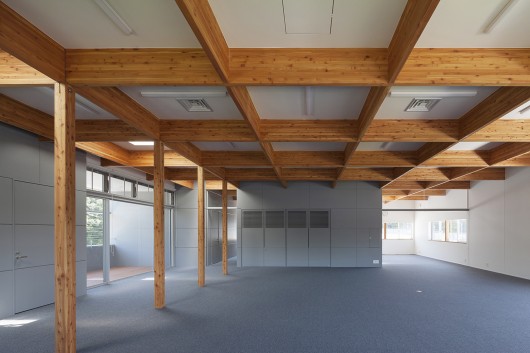 The hall for regional exchange (2nd floor of the office working unit) formed a big space by the wooden lattice beams. The outside aluminum eaves (the office working unit) block the summer sunlight, at the same time, the eaves make the shadow to the building outer wall.