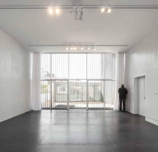 The contrast between the white surfaces (plaster walls and painted metal and wood structural elements) and the black ones (aluminium windows, the black iron shades and the black VIROC panels) achieved to expressed our conceptual goal.