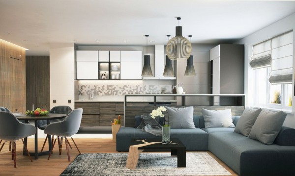 The next space from the designers at ART UGOL takes on the challenge of a small kitchen and living area. In the final design, the kitchen is cordoned off with its breakfast bar and disparate flooring but ultimately everything still flows together.