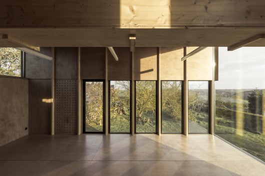 The space provides an escape from every known frame of reference. It clears away limits through a rupture in form, scale, and structure. It marks the will to create a special and unique place. Abandoning the roof in order to create a simple form without any particular associations, the walls are covered inside and out with wooden boards. The dimension of the main window, unusual and nonstandard, entirely modifies the relationship with the exterior. From the concealment of the structure—so that the window can open completely onto the landscape—to the repetition of the lamps into the distance through a game of reflection, the space leads its occupants into towards an unknown and mysterious world.