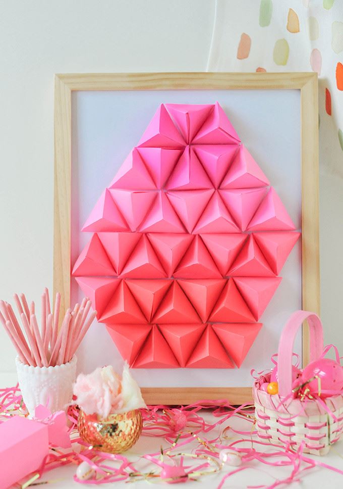 Let’s start by setting the stage with some eye-catching decorations. We’re loving this DIY Geometric Easter Egg from Proper, created with colorful paper triangles. A modern spin on a classic Easter symbol!