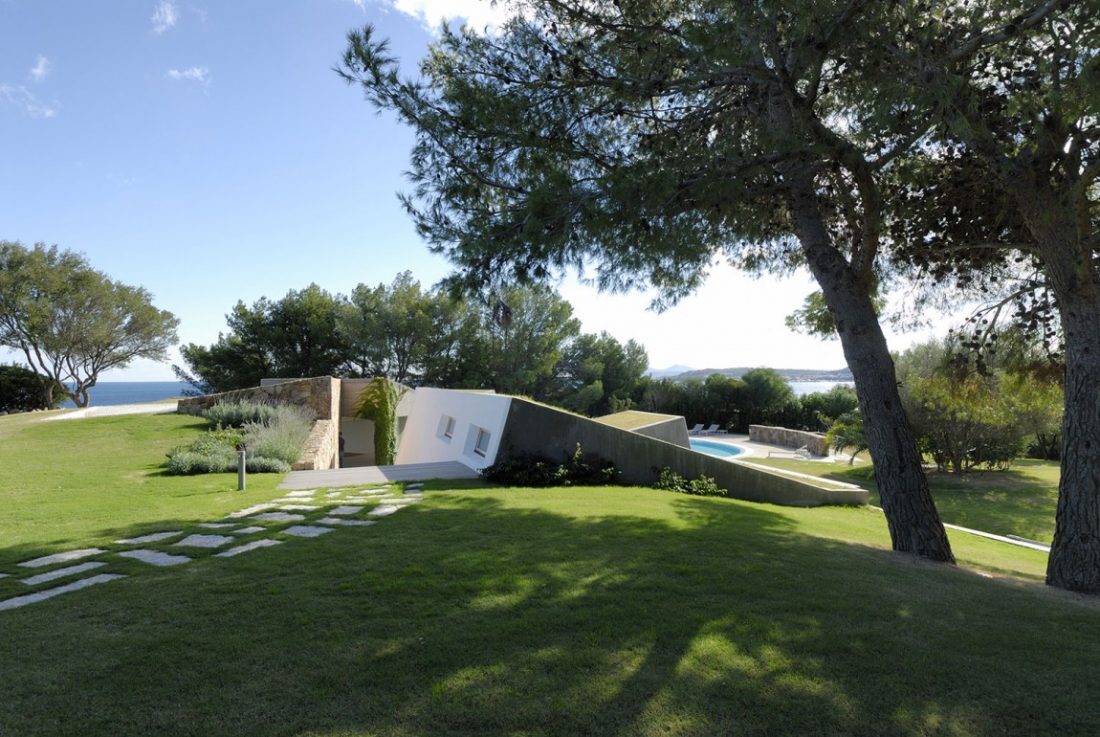 The location and the site often dictate the design of the structure built on it. So what kind of home do you build when you have a site with gorgeous bay views on a gentle slope? The answer can be found in the following photos describing a residence located in Sardinia, Italy.
